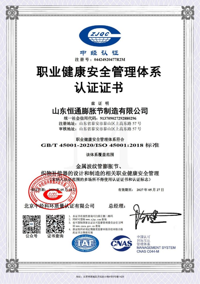 公司取得我國特種設(shè)備制造許可證、壓力容器A1級資質(zhì)、壓力管道元件A、B的資質(zhì),并且獲得了歐盟PED-CE認證、美國ASME“U”鋼印、ISO 9000質(zhì)量管理體系認證、GB/T 14000 環(huán)境管理體系認證及GB/T 45000 職業(yè)健康安全體系認證。膨脹節(jié)產(chǎn)品涵蓋壓力管道波紋膨脹節(jié)、壓力容器波形膨脹節(jié)、金屬波紋管、金屬軟管、聚四氟補償器、橡膠補償器及非金屬補償器等。